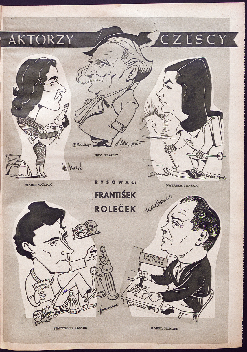 Zbiór karykatur słynnych aktorów czeskich, autorstwa Frantiska Rolecka.
