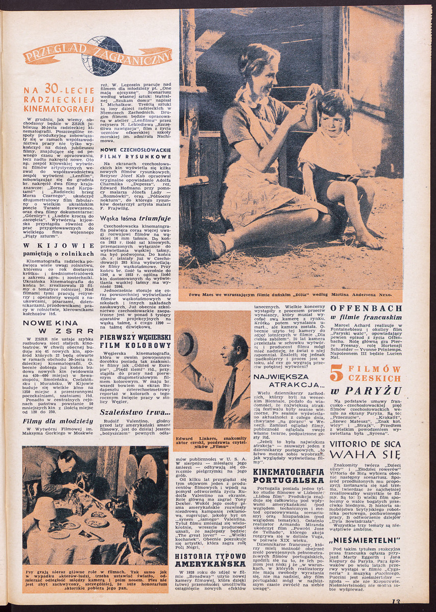 Przegląd zagraniczny, na 30-lecie kinematografii radzieckiej, Zorza nad Karpatami, Radziecki brzeg Morza Czarnego, współzawodnictwo, Taras Szewczenko, Górnicy, Ludzie kroczą do szczęścia, Piąty szturm, w Kijowie pamiętają o rolnikach, nowe kina w ZSRR, filmy dla młodzieży, Wytwórnia Filmowa im. Gorkiego, One mają ojczyznę, W. Legoszin, T. Michałkow, Lenfilm, N. Lebiediew, Szczęśliwa nawigacja, nowe czechosłowackie filmy rysunkowe, Józef Kab, Adolf Charmlik, Depesza, Edward Hofmann, Józef Lada, Rozmówki, Północny nokturn, F. Frajwilig, Wąska taśma triumfuje, węgierski film kolorowy, Gdzieś w Europie, Piędź ziemi, Rudolf Valentino, Tony Dexter, Wielki kochanek, Pola Negri, Broadway, kamera przenośna, Dla ciebie zabiłem, Biennale w Wenecji, kinematografia portugalska, Lisboa film, Armando Miranda, Powrót Jose de Telhado, Offenbach w filmie francuskim, Marcel Achard, Paryski Walc, Pierre Fresnay, Yvonne Printemps, Lucien Nat, Przeczucie, Krakatit, Szewc Mateusz, Znak kotwicy, Strajk, Syrena, Dzieci ulicy, Złodzieje rowerów, Vittorio de Sika, Nieśmiertelni, Marta Eggert, Jan Kiepura, Cyganeria, Puccini