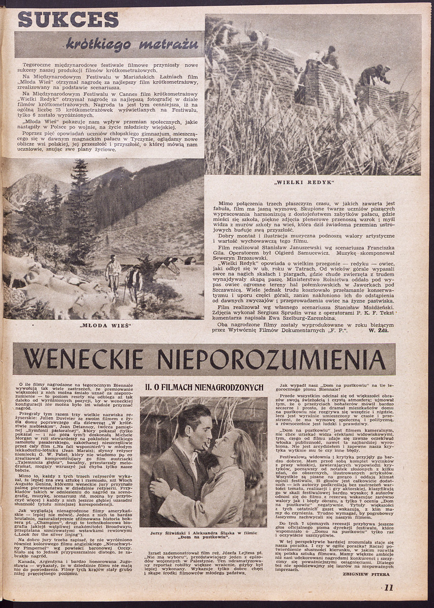 Sukces krótkiego metrażu, festiwale filmowe, Międzynarodowy Festiwal Filmowy w Mariańskich Łaźniach, nagroda za najlepszy film krótkometrażowy, Wielki Redyk, Młoda Wieś, Międzynarodowy Festiwal Filmowy W Cannes, Najlepsza fotografia, Stanisław Januszewski, Franciszek Gil, Olgierd Samucewicz, Seweryn Brzozowski, Stanisław Mrożdżeński, Sergiusz Sprudin, Ewa Szelburg-Zarembina, Wytwórnia Filmów Dokumentalnych, Weneckie nieporozumienia, Biennale, Festiwal w Wenecji, Julien Duvivier, W królestwie niebieskim, Jean Delannoy, Symfonia pastoralna, Michele Morgan, G.W. Pabst, Tajemnicza głębia, Augusto Genina, Champion, Nieuchwytny Pimpernel, Józef Lejtes, Nie ma wyboru, Dom na pustkowiu, Zbigniew Pitera