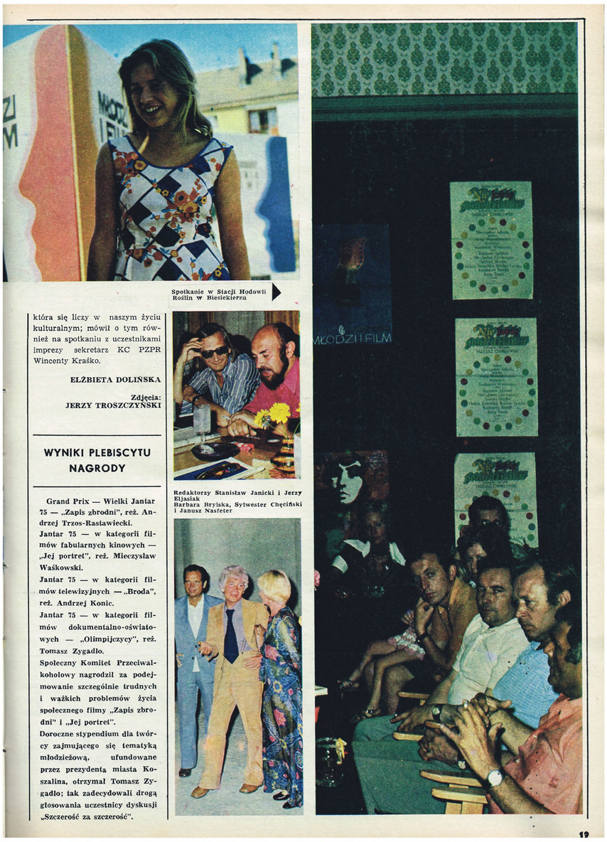 Koszalińskie spotkania, Alicja Jachiewicz, Wacław Kowalski, Beata Tyszkiewicz, Elżbieta Dolińska, Mieczysław Waśkowski, Marek Frąckowiak, Tadeusz Zawierucha, Grażyna Michalska, Piotr Łysak, Barbara Brylska, Stacja Hodowli Roślin w Biesiekierzu, Jerzy Troszczyński, Stanisław Janicki, Jerzy Eljasiak, Sylwester Chęciński, Janusz Nasfeter, Zapis zbrodni, Andrzej Trzos-Rastawiecki, Jej portret, Mieczysław Waśkowski, Broda, Andrzej Konic, Olimpijczycy, Tomasz Zygadło, Międzynarodowe Spotkania Filmowe, Młodzi i film, Moja wina moja miłość, Ostatnich gryzą psy, Chleba naszego powszedniego, Janusz Zaorski, Koniec babiego lata, Ewa Kruk, Wizyta, Marcel Łoziński, Mam 19 lat, Juliusz Janicki, Dlaczego, Barbara Sokolenko, Kto szuka złotego dna, Jiří Menzel, Ten prawdziwy mężczyzna, Aleksander Obreszkow, Niedokończonezdanie, Zoltán Fábri, Dobry Filip, Dan Pita, Był sobie drozd, Otar Ioseliani, Niobe, Leszek Herdegen, Nakaz aresztowania, Wytłumacz mi stary, Henryk Giżycki, Jacek Strama, Stresy XX wieku, Nie będę cię kochać, Narkomani