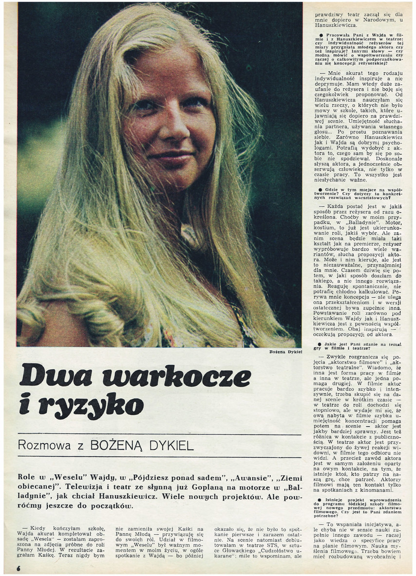 Bożena Dykiel opowiada o projektach, które otworzyły jej drogę do kariery - rolach u Andrzeja Wajdy oraz Adama Hanuszkiewicza. Porównuje również pracę w filmie i teatrze, udzielając przy tym wskazówek początkującym aktorom.