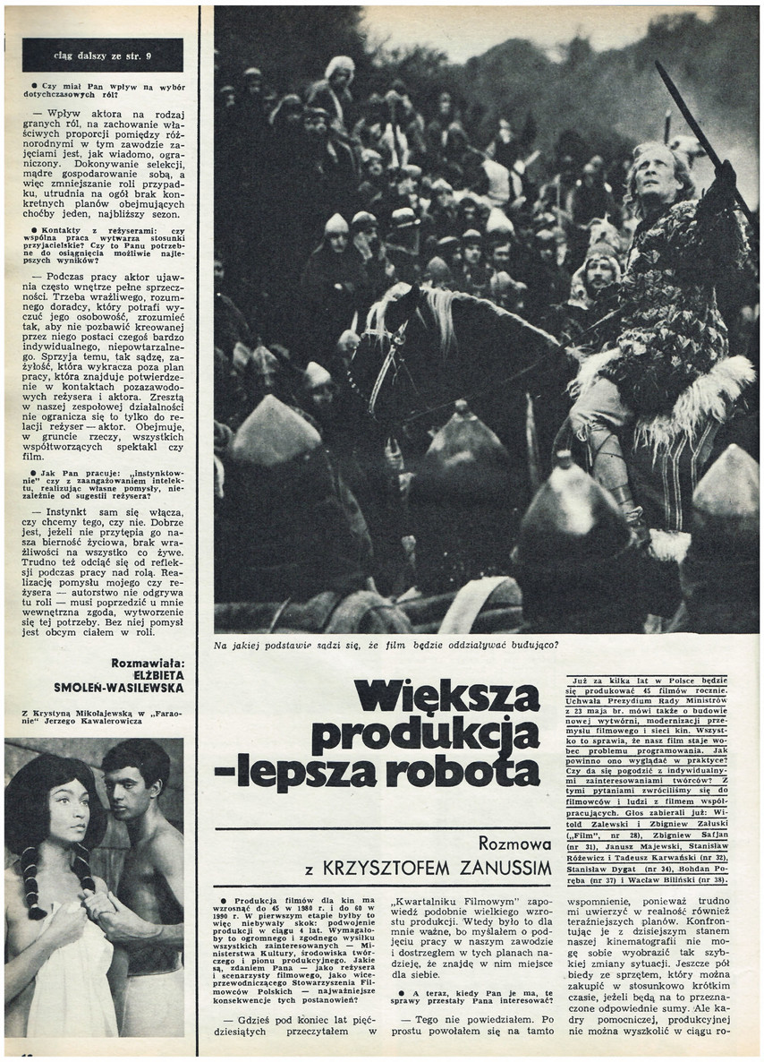 Większa produkcja - lepsza robota, Krzysztof Zanussi, produkcja filmowa, wywiad, Gniazdo, Znikąd donikąd, Wieczne pretensje, Wanda Wertenstein, Potrzeba wrażliwości, wywiad, Jerzy Zielnik, Witold Orzechowski, Jej powrót, Dzieje grzechu, Walerian Borowczyk, Kazimierz Kutz, Znikąd donikąd, Oczekujący, Imre Gyöngyössy, Mindowe, Teatr Dramatyczny, Juliusz Słowacki, Jerzy Kawalerowicz, Faraon, aktor, Elżbieta Smoleń-Wasilewska, Krystyna Mikołajewska