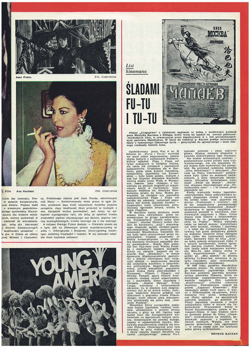 W kontynuacji działu "Kinorama" przeczytamy list Henryka Kaczana, Polaka urodzonego w Harbinie. Opowiada on o dystrybuowaniu filmów europejskich i amerykańskich w Chinach.