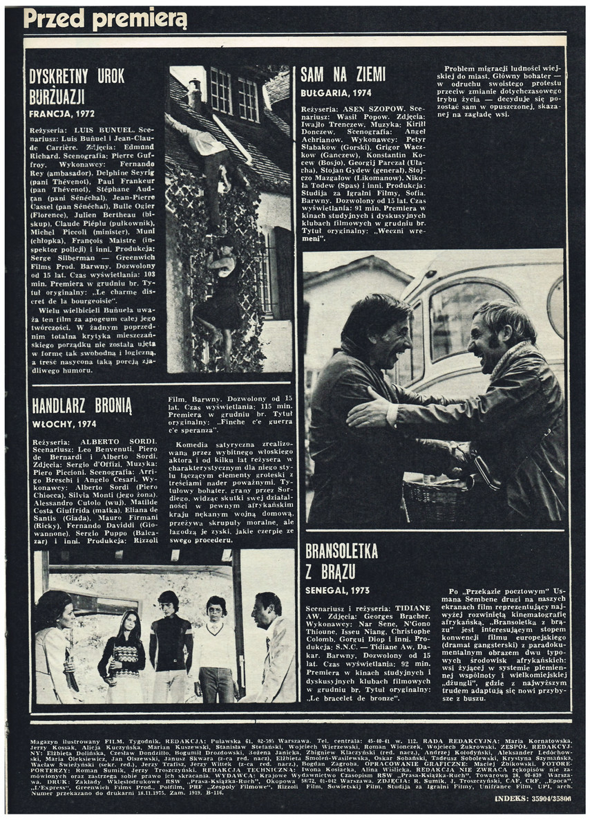 Przed premierą, Dyskretny urok burżuazji, Sam na ziemi, Handlarz bronią, Bransoletka z brązu, Luis Buñuel, Asen Szopow, Alberto Sordi, Tidiane Aw, Jean-Claude Carrière, Edmond Richard, Fernando Rey, Paul Frankeur, Delphine Seyrig, Bulle Ogier, Stéphane Audran, Jean-Pierre Cassel, Julien Bertheau, Milena Vukotic, Wasił Popow, Iwajło Trenczew, Kiriłł Donczew, Angeł Achrianow, Petyr Słabakow, Grigor Waczkow, Konstantin Kocew, Georgij Parczał, Stojan Gydew, Stojczo Mazgałow, Nikoła Todew, Leo Benvenuti, Piero de Bernardi, Sergio d’Offizi, Piero Piccioni, Arrigo Breschi, Angelo Cesari, Alberto Sordi, Silvia Monti, Alessandro Cutolo, Matilde Costa Giuffrida, Eliana de Santis, Mauro Firmani, Fernando Daviddi, Sergio Puppo, Georges Bracher, Nar Sene, N'Gono Thioune, Isseu Niang, Christophe Colomb, Gorgui Diop