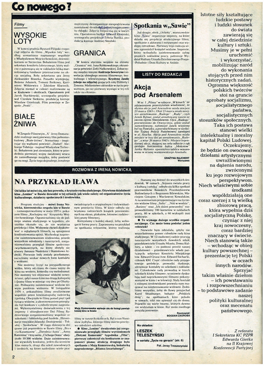 Co nowego?, Maja Komorowska, Bogdan Zagroba, Grażyna Rajchert, Edward Gierek, KC PZPR, przemówienie, referat, Ryszard Filipski, Wysokie Loty, Władysław Wojciechowski, Jerzy Aleksander Braszka, Bożena Adamek, Tomasz Borkowy, Kazimierz Witkiewicz, Zdzisław Klucznik, Jacek Stachlweski, Czesław Siekiera, Wiesław Grzelak, Profil, Jerzy Domaradzki, Białe Żniwa, Diabeł, Aleksiej Tołstoj, Władysław Telecki, Edward Kłosiński, Teresa Barska, Andrzej Smulski, Granica, Jan Rybkowski, Zofia Nałkowska, Andrzej Seweryn, Krystyna Janda, kino Sawa, Rudy, Janek Bytnar, Irena Nowicka, wywiad, kino Lenino, Kochajmy się, Krzysztof Wojciechowski, Janusz Nasfeter, Stanisław Jędryka, Dni Filmu Radzieckiego, Iława, Dostojewski, Tołstoj, Szołochow, Bracia Karamazow, Zbrodnia i kara, Cichy Don, Złote Kamery, Bilans kwartalny, Bogusz Bilewski, Maciej Góral, Wacław Kowalski, Salto, Nóż w wodzie, Bariera, Ich dzień powszedni, Edward Gruza, Edward Sochacki, Karol Strasburger