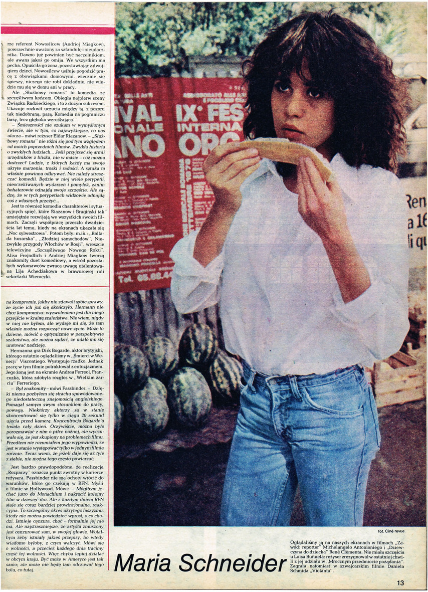 Marzenia urzędników, Eldar Rizanow, Emil Bragiński, Służbowy romans, komedia, Noc sylwestrowa, Ballada Huzarska, Złodziej samochodów, Niezwykłe przygody Włochów w Rosji, Szczęśliwego Nowego Roku, Lija Achedżakowa, Na rozdrożu, Rainer Werner Fassbinder, Rozpacz, Vladimir Nabokow, Tom Stoppard, faszyzm, Śmierć w Wenecji, Andrea Ferreol, Wielkie żarcie, Fellini, Maria Schneider, Zawód: reporter, Michelangelo Antonioni, Dziewczyna do dziecka, René Clément, Rene Clement, Luis Buñuel, Luis Bunuel, Mroczny przedmiot pożądania, Daniel Schmid, Violanta
