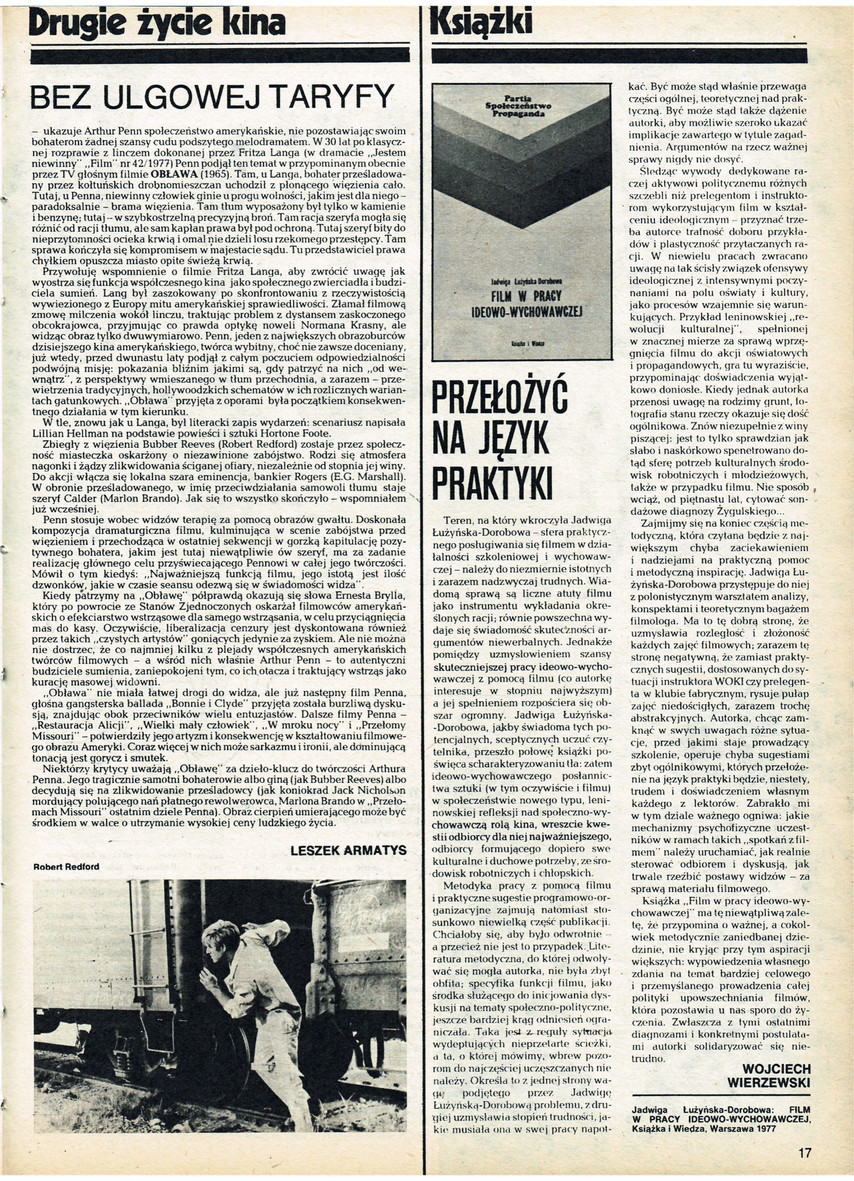 Leszek Armatys, felieton, Bez ulgowej taryfy, Arthur Penn, Fritz Lang, Obława, Roman Krasny, Lillian Hellman, Hortone Foote, Robert Redford, E.G. Marshall, Marlon Brando, Ernest Bryll, Bonnie i Clyde, Restauracja Alicji, Wielki mały człowiek, W mroku nocy, Przełomy Missouri, Wojciech Wierzewski, Książki, Przełożyć na język praktyki, Jadwiga Łużyńska-Doborowa, edukacja, szkolnictwo, oświata, posłannictwo ideowo-wychowawcze, filmologia, Film w pracy ideowo-wychowawczej