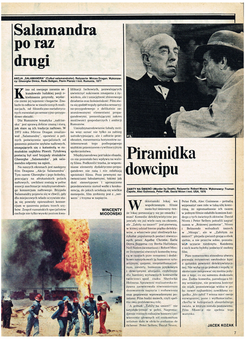Wincenty Miodoński, recenzja, Salamandra po raz drugi, Akcja Salamandra, Mircea Dragan, Zabity na śmierć, Robert Moore, tematyka nafciarska, Salamandra, film sensacyjno-przygodowy, Jacek Kozak, komedia detektywistyczna, Agatha Christie, Earl Biggers, Brett Halliday, Neil Simon, Robert Moore, pure nonsens, humor sytuacyjny, Sherlock Holmes, Peter Sellers, David Niven, Peter Falck, Alec Guinness, David Niven, Różowa pantera, Belmondo, Mózg