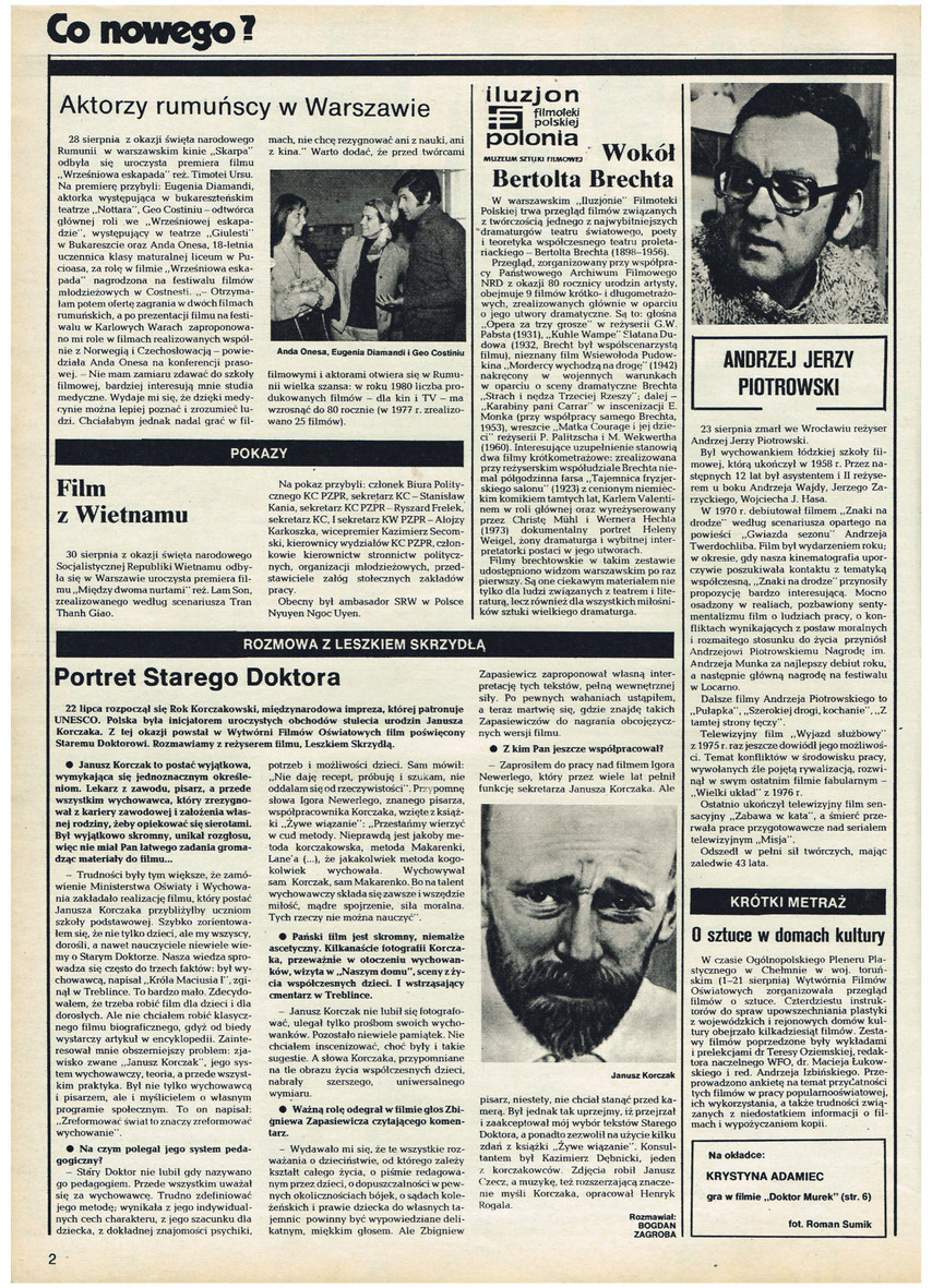 Co nowego?, Anda Onesa, Eugenia Diamandi, Geo Costiniu, Andrzej Jerzy Piotrowski, Janusz Korczak, Aktorzy rumuńscy w Warszawie, Skarpa, Wrześniowa eskapada, Timotei Ursu, Eugenia Diamandi, Nottara, Wrześniowa eskapada, Giulesti, Anda Onesa, Film z Wietnamu, Między dwoma nurtami, Lam Son, Tran Thanh Giao, Stanisław Kania, Ryszard Frelek, Alojzy Karkoszka, Kazimierz Secomski, Nyuyen Ngoc Uyen, Iluzjon Filmoteki Polskiej, Wokół Bertolta Brechta, Państwowego Archiwum Filmowego NRD, Opera za trzy grosze, G.W. Pabst, Kuhle Wampe, Slatan Dudow, Wsiewołod Pudowkin, Mordercy wychodzą na drogę, Strach i nędza Trzeciej Rzeszy, Karabiny pani Carrar, E. Monk, Matka Courage i jej dzieci, P. Palitzsch, M. Wekwerth, Tajemnica fryzjerskiego salonu, Karl Valentin, Christa Mühl, Werner Hecht, Helena Weigel, Andrzej Wajda, Jerzy Zarzycki, Wojciech J. Has, Znaki na drodze, Gwiazda sezonu, Andrzej Twerdochlib, Nagroda im. Andrzeja Munka, Pułapka, Szerokiej drogi, kochanie, Z tamtej strony tęczy, Wyjazd służbowy, Wielki układ, Zabawa w kata, Misja, Portret Starego Doktora, Rok Korczakowski, UNESCO, Janusz Korczak, Wytwórnia Filmów Oświatowych, Leszek Skrzydła, Stary Doktor, Król Maciuś I, Igor Newerly, Żywe wiązanie, Zbigniew Zapasiewicz, Kazimierz Dębnicki, Janusz Czecz, Henryk Rogala