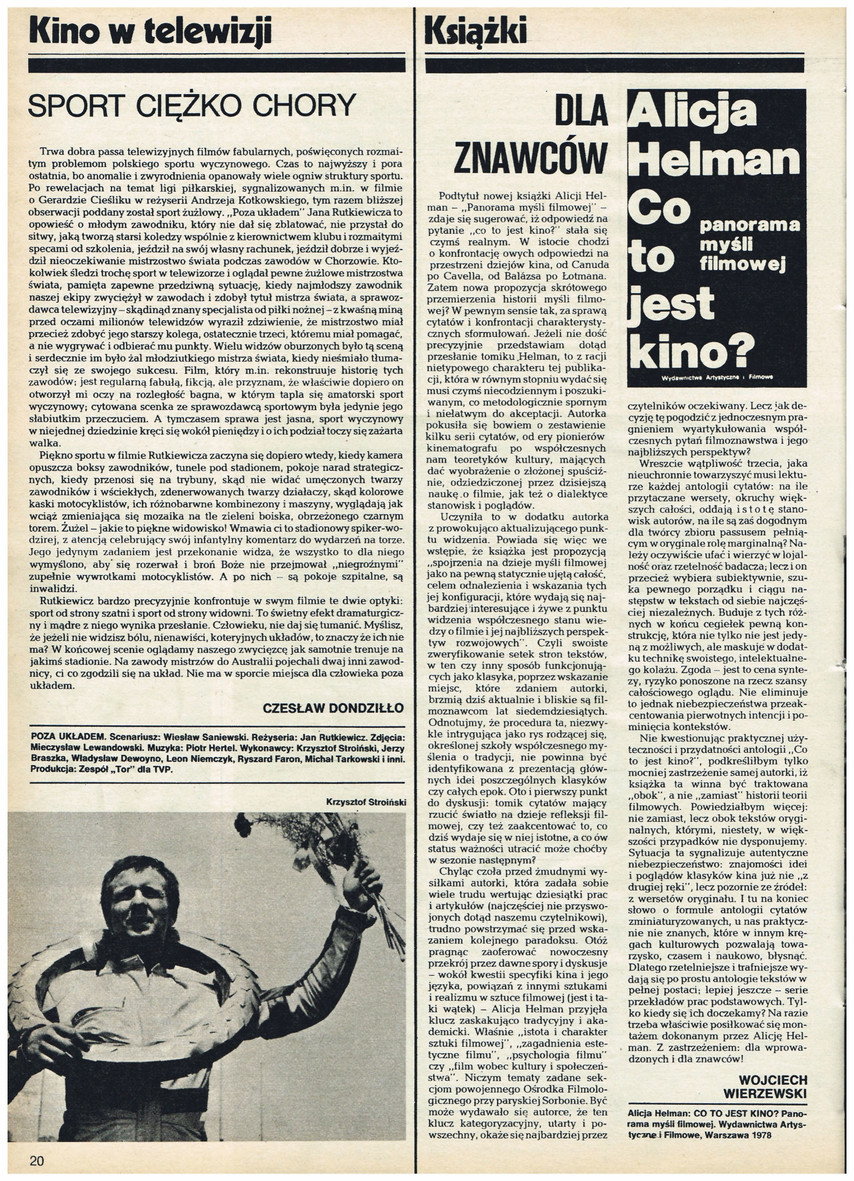 Czesław Dondziłło, Sport ciężko chory, Poza układem, Kino w telewizji, Wiesław Saniewski, Jan Rutkiewicz, Mieczysław Lewandowski, Piotr Hertel, Krzysztof Stroiński, Jerzy Braszka, Władysław Dewoyno, Leon Niemczyk, Ryszard Faron, Michał Tarkowski, Zespół Tor, Gerard Cieślik, Andrzej Kotkowski, Poza układem, żużlowe mistrzostwa świata, Wojciech Wierzewski, Alicja Helman, Co to jest kino?, Panorama myśli filmowej, dzieje kina, Canud, Cavell, Balazs, Łotman, pionierzy kinematografu, teoretycy kultury, istota i charakter sztuki filmowej, zagadnienia estetyczne filmu, psychologia filmu, film wobec kultury i społeczeństwa, historia teorii filmowych