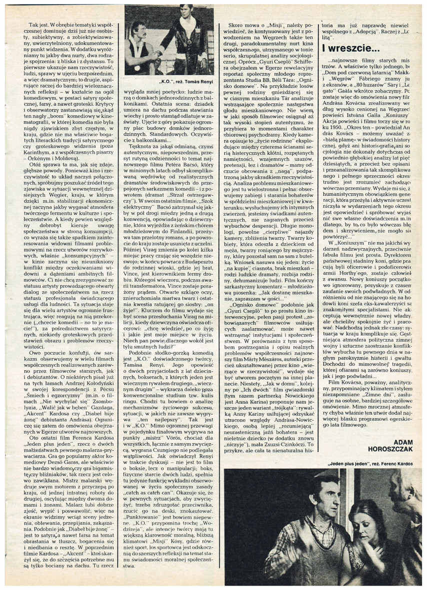 Adam Horoszczak, korespondencja własna, Blaski filmowego lata, K.O., Tomas Renyi, „Jeden plus jeden, Ferenc Kardos, ujęcie bezpośrednie, ujęcie dramatyczne, satyra społeczna, fara, groteska, Andrzej Kołodyński, Śmiech i egzorcyzmy, Dezsó Garas, Diabeł bije żonę, obrastanie w tłuszcz, bogacenie się, Akcent, Peter Bacsó, Szok elektryczny, analiza mechanizmów życiowego sukcesu, Misja, Kosa, Gyuri Csepló Schiffer, Bela Tar, Ognisko domowe, kino interwencyjne, Marta Meszaros, Jak w domu, Ich dwóch, Anna Karina, Zsuzsi Czinkóczi, Dom pod czerwoną latarnią, Makk, Węgrzy, Fabri, 80 huzarów, Saro, Legato, Istvan Gall, Koniuszy, Zimne dni