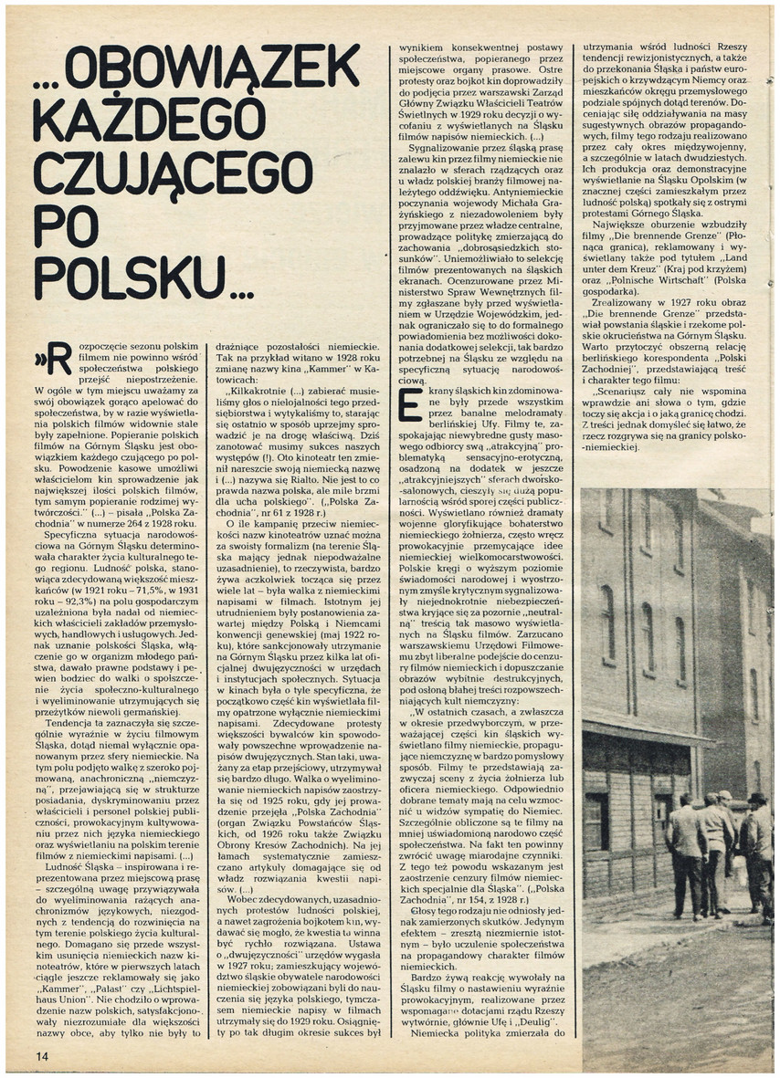 Weronika Rzepka, Film na Śląsku w latach międzywojennych, Polska Zachodnia, Górny Śląsk, sytuacja narodowościowa, spolszczenie życia społeczno-kulturalnego, niewola germańska, życie filmowe Śląska, konwencja genewska, Ustawa o „dwujęzyczności" urzędów, Zarząd Główny Związku Właścicieli Teatrów Świetlnych, dobrosąsiedzkie stosunki z Niemcami, Michał Grażyński, problematyka sensacyjno-erotyczna, sfery dworsko-salonowe, niemiecka wielkomocarstwowość, Urząd Filmowy, propagandowy charakter filmów niemieckich, Die brennende Grenze, Płonąca granica, Land unter dem Kreuz, Kraj pod krzyżem, Polnische Wirtschaft, Polska – gospodarka