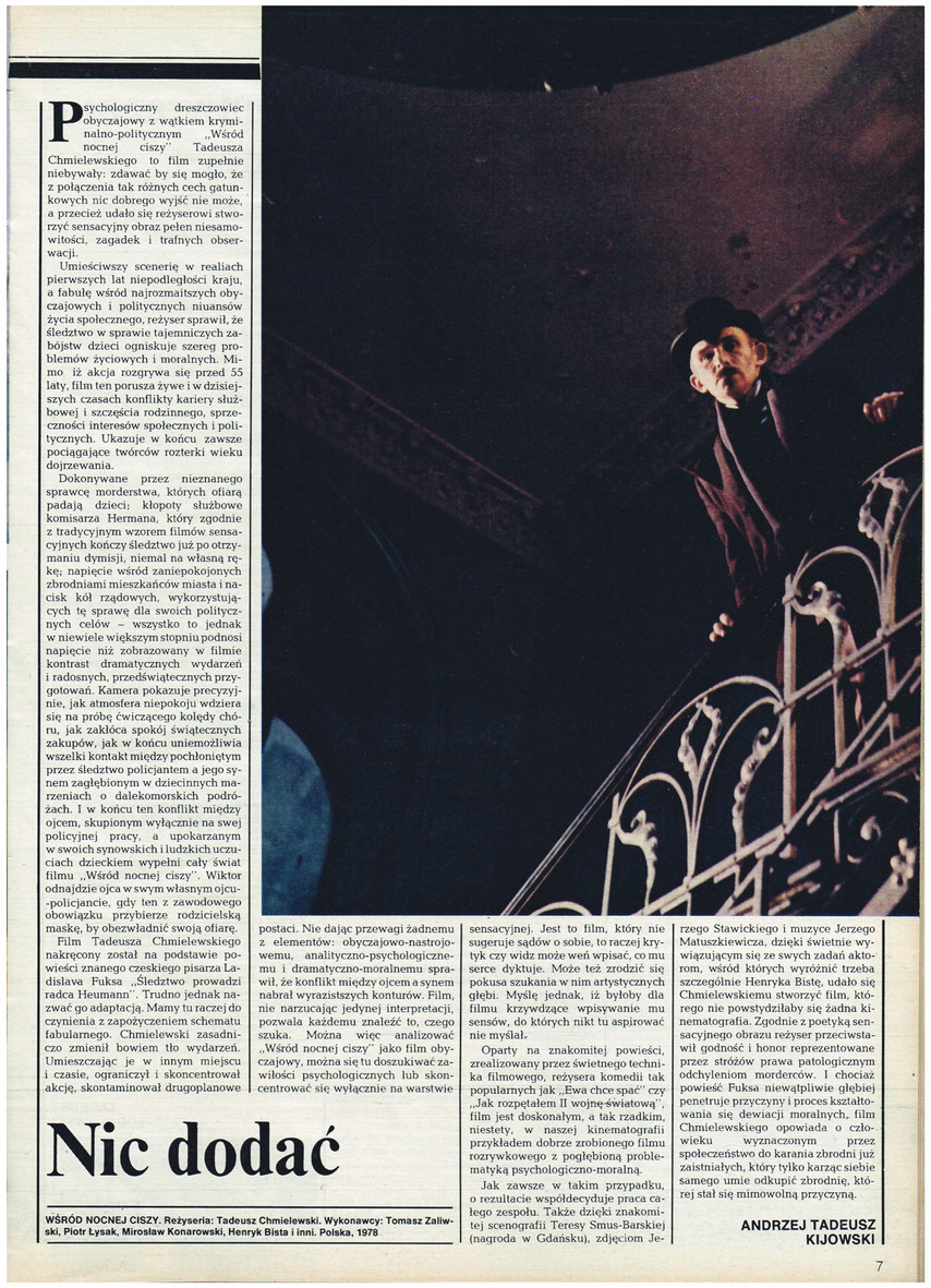 Andrzej Tadeusz Kijewski, recenzja, Wśród nocnej ciszy, Tadeusz Chmielewski, Tomasz Zaliwski, Piotr Łysak, Mirosław Konarowski, Henryk Bista, dreszczowiec obyczajowy, rozterki wieku dojrzewania, Ladislav Fuks, Śledztwo prowadzi radca Heumann, zapożyczenie schematu fabularnego, Ewa chce spać, Jak rozpętałem II wojnę-światową, film rozrywkowy, Teresa Smus-Barska, Jerzy Stawicki, Jerzy Matuszkiewicz