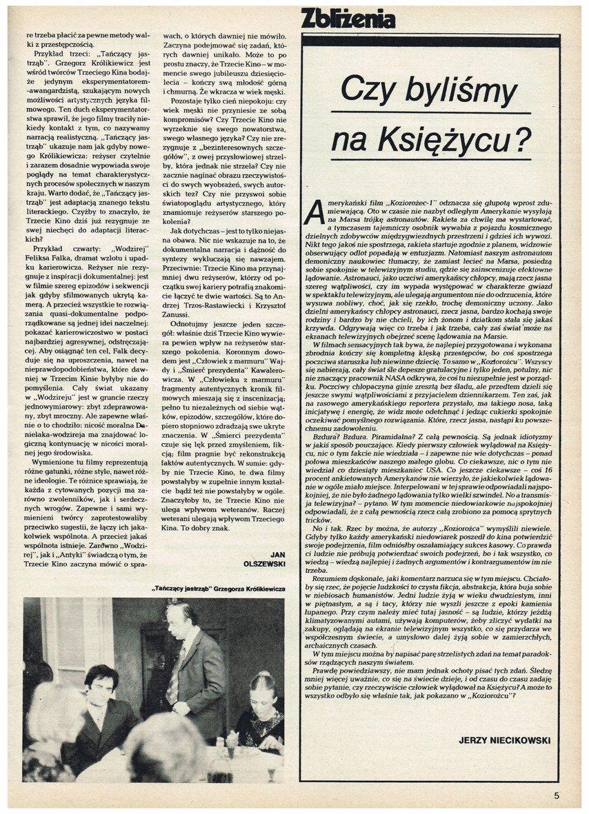 Jan Olszewski, Antyki, Krzysztof Wojciechowski, W środku lata, Feliks Falk, fotografia autentycznego świata, Trzecie Kino, Andrzej Trzos-Rastawiecki, Marek Piwowski, Grzegorz Królikiewicz, Krzysztof Wojciechowski, Krzysztof Kieślowski, Tańczący jastrząb, dokumentalna metoda narracji, Kochajmy się, Rodzina, myśl syntetyzująca, Reis, Nauka latania, Sławomir Idziak, W środku lata, Feliks Falk, Roman Polański, Nóż w wodzie, Antyki, film sensacyjny o aferze przemytniczej, Przepraszam, czy tu biją?, Tańczący jastrząb, eksperymentator- -awangardzista, Wodzirej, Feliks Falk, Człowiek z marmuru, Śmierć prezydenta, Kawalerowicz, Czy byliśmy na Księżycu?, Jerzy Niecikowski, felieton, Koziorożec – 1, lądowanie na Księżycu